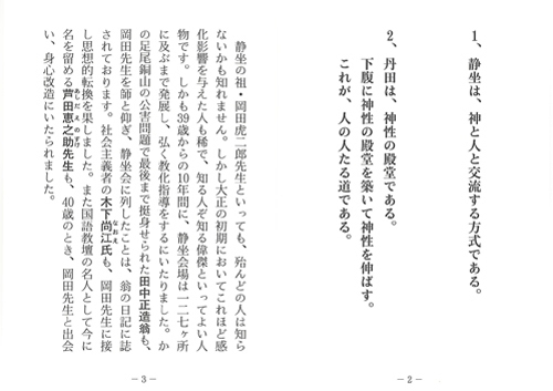 ●岡田虎二郎先生プロフィール 1872年、愛知県生まれ。 高等小学校卒業後、農業に従事し、渥美郡農業主事となる。 その後30歳で単身渡米、3年後に帰国し、人間本来の自然体形と呼吸法を基にした静坐法を創案、日本人の心身開発に力を尽くした。皇族・軍部・政治家・大学・会社の中心層の名士から庶民まで、明治・大正期に一世を風靡し、これに帰依する者は数万人に及んだと伝えられている。田中正造・木下尚江などをはじめとして多くの人が虎二郎を偉大な人物として称賛した。 一週間に77会場をまわり、一日3時間の睡眠で日曜祭日も休まず指導し続けたが、大正9年、惜しくも49歳で逝去された。 たねまき文庫シリーズ |