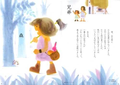 ある日、ふわふわのパンとワインをもって、森まで木を切りに出かけました・・・。