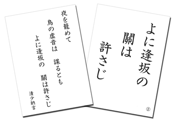 読み手が上の句を読んで、取り手は対となる下の句の札を探しましょう。