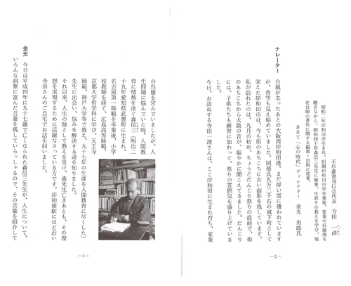 ●寺田一清先生プロフィール 昭和2年、大阪府生まれ。 旧制岸和田中学校を卒業後、東亜外事専門学校に進むも病気のため中退。以後、家業の呉服商に60歳まで従事。 昭和40年、38歳で生涯の師森信三先生に邂逅、以来永く師事し、「森信三(続)全集」、「幻の講話」「契縁録」「余光録」等、数多くの著作の編集・発行を担う。 社団法人「実践人の家」元常務理事、「不尽叢書刊行会」代表。 現在、執筆活動の傍ら、森信三先生の教えを広めるため、日本各地で講演会や読書会を行っている。 |