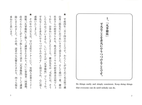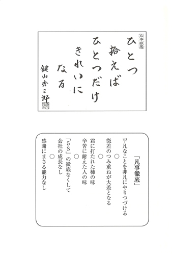 ●鍵山秀三郎先生プロフィール 1933年東京都生まれ。 1952年岐阜県立東濃高校を卒業後、1953年東京のデトロイト商会入社するも、28歳で退社。1961年、独立して株式会社ローヤルを創業、1993年『日本を美しくする会』を発足した。1997年イエローハットに社名変更。翌年社長を引退。 現在、『日本を美しくする会』相談役。その後、全国各地に「掃除に学ぶ会」も誕生し、多くの支持者が続出している。 |