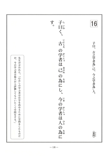 そのようにする意義を持っていることを歴史が証明してきた書物こそが、『論語』のような古典なのです。書店にいけば、成功者や作家が誇らしげに人生訓を語る書物があふれています。しかしそのうちいったい何冊が後世まで読み継がれるでしょうか。それに対して『論語』が人々に励ましや救いをあたえてきた時間の長さは、悠久といってもよいほどです。今の子供たちが一生覚えている価値は十分にあるのです。