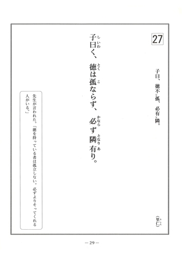 そもそも豊かな経験と深い省察にささえられた古典の言葉を子供のうちに完全に理解することなどは不可能なことです。子供に最初から無理に理解することを求めるのではなく、まずその言葉自体を身にしみこませることが大事です。