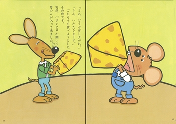 ●スタッフコメント● テーブルに並ぶ果物にチーズ、ハムに魚・・・。チーズを食べようと大きな口をあける鼠くんを見ていると、こっちまでお腹がすいてくる気がします♪ |