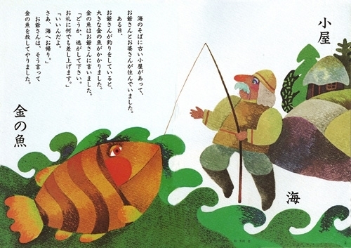 金の魚の願いに、お爺さんは何も望まず放してやります。