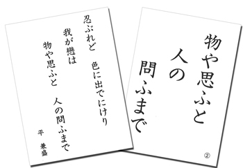 句一覧に、歌をそれぞれ漢字かな交じり文とひらがな表記にて記載しています。古典ならではの言い回しは、なじみのない場合もございますのでどうぞご活用ください。